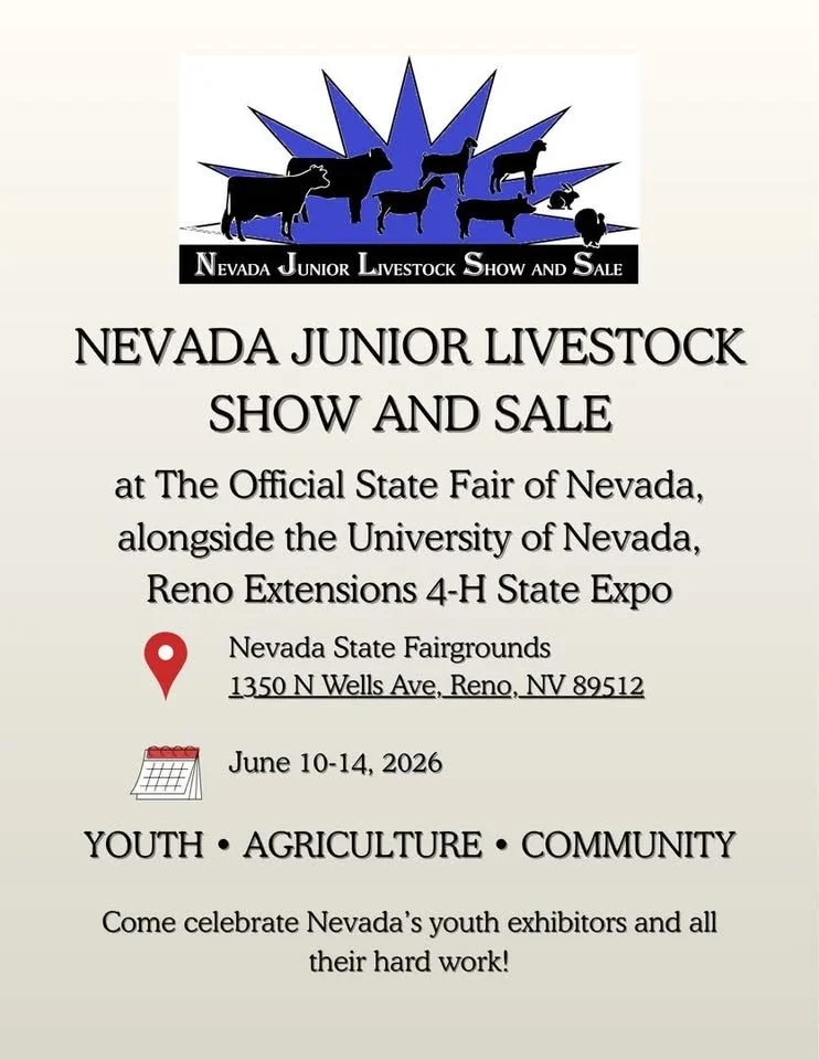 Nevada Junior Livestock Show & Sale Wednesday, June 10, 2026 10:30 AM Sunday, June 14, 2026 11:30 PM Reno Livestock Events Center 1350 North Wells Avenue Reno, NV, 89512 United States (map) Google Calendar ICS Sharpening On-SiteNevada Junior Livestock Show & Sale Learn more from the website Learn more from the website